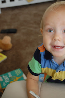 So, this morning I decided to whip out the Nikon and get busy. I was ready to snap some great pictures to mount on our new walls and send to those ever-eager Grandparents. I put him in a clean handsome outfit AND combed out his mangy bed hair (that still has some nail polish stuck in it.) We went in his room- I opened the blinds... nice morning light. My excitement was uncontainable.
